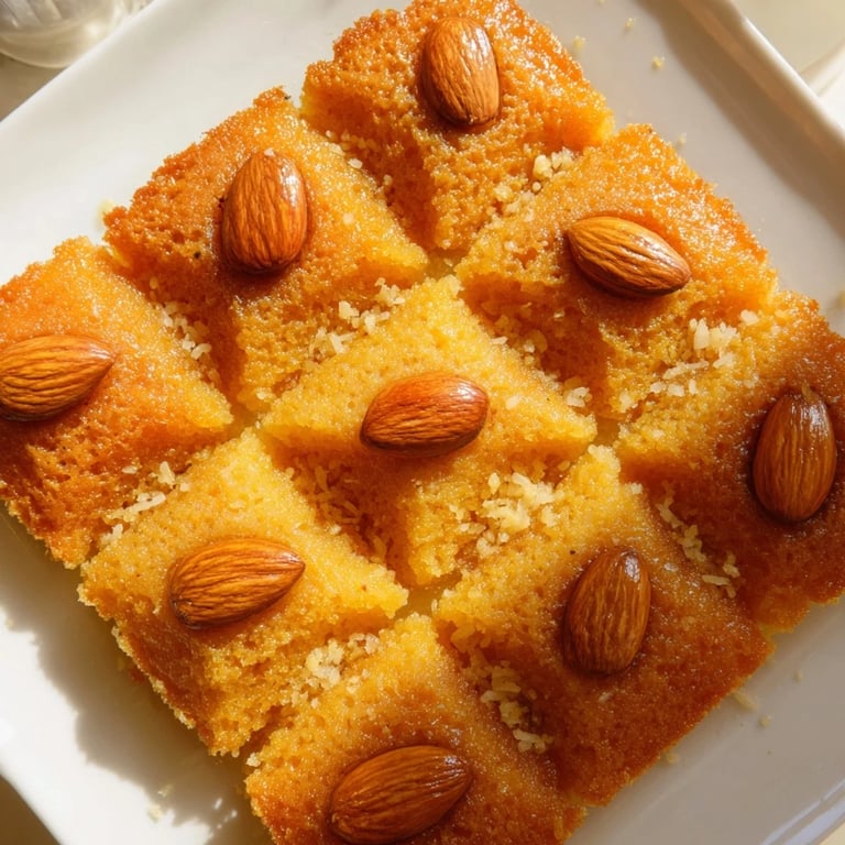 There's this moment between the baking and the syrup-pouring where basbousa sits in a liminal space. Fresh out of the oven, it's got crispy edges and a barely-set interior, almost fragile. Then you pour that cool syrup over it and everything shifts: the cake soaks it up, becomes tender, almost custardy in the center. Some people prefer it immediately after that transformation, when there's still a little contrast between the firmer outside and the silky center. Others let it sit for hours or even overnight and eat it the next morning, when it's become uniformly moist and almost gelatinous in the best way.