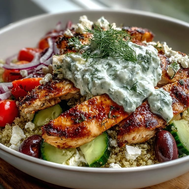 - Start with a bed of fluffy quinoa, then arrange your sliced chicken on top like you're building something beautiful. Add the cucumber, tomatoes, red onion, and olives in clusters rather than scattering them randomly, then finish with a generous dollop of tzatziki and a sprinkle of fresh parsley.