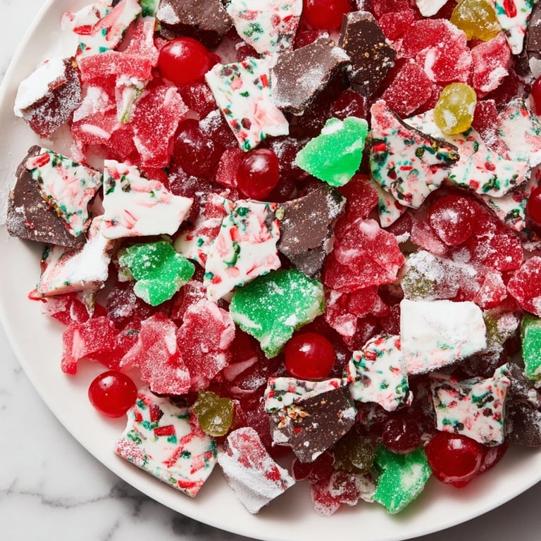Pin It A festive dessert platter featuring a colorful assortment of homemade rock candies holiday-themed chocolates and sparkling sugar confections perfect for adding a sweet eye-catching centerpiece to your holiday table.