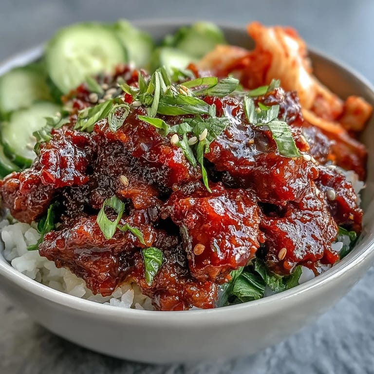 Pin It My coworker brought a Korean beef bowl to lunch one Tuesday, and the entire office smelled like gochujang and sesame within minutes. I watched her eat it with this quiet satisfaction, layering bites of spicy beef with cool cucumber and tangy kimchi, and I realized I'd been missing out on something genuinely delicious. That evening, I stood in my kitchen with a jar of gochujang and no real plan, just determination to recreate that balance of heat, funk, and brightness I'd been craving all afternoon.