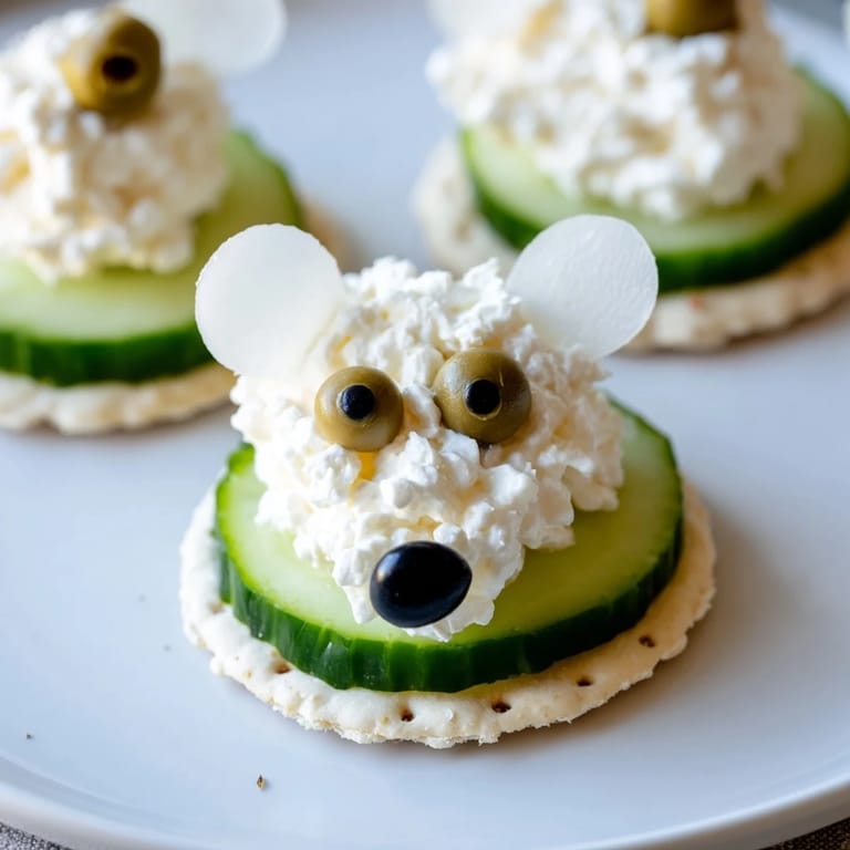- Using a small spoon or piping bag, drop a rounded mound of cream cheese mixture onto the cucumber slice as the polar bears head.