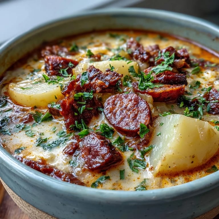 Pin It The smell of chorizo hitting hot olive oil is what pulled my flatmate out of bed one rainy Saturday morning. I was experimenting with leftovers, a couple of sad leeks and some potatoes that needed using, and I'd tossed in chorizo on a whim. That red, paprika-scented oil changed everything. What started as fridge cleanup turned into the soup I now make every time the weather turns grey and unforgiving.