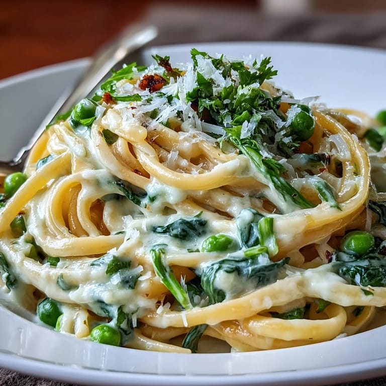One Saturday, a friend dropped by unexpectedly and I tossed this together while we caught up on the week's chaos, laughter echoing above the bubbling pasta. She claimed the aroma alone made her feel like spring had arrived inside our little apartment, and the silky sauce convinced her to ask for seconds. The spinach melted into the noodles while the peas kept their gentle crunch—every forkful felt like a fresh discovery. I still remember how the lemon zest stuck to my fingers and somehow got on the dog, who looked extra festive that day. Cooking together felt delightfully unrushed, and the dish was the centerpiece of our impromptu gathering.