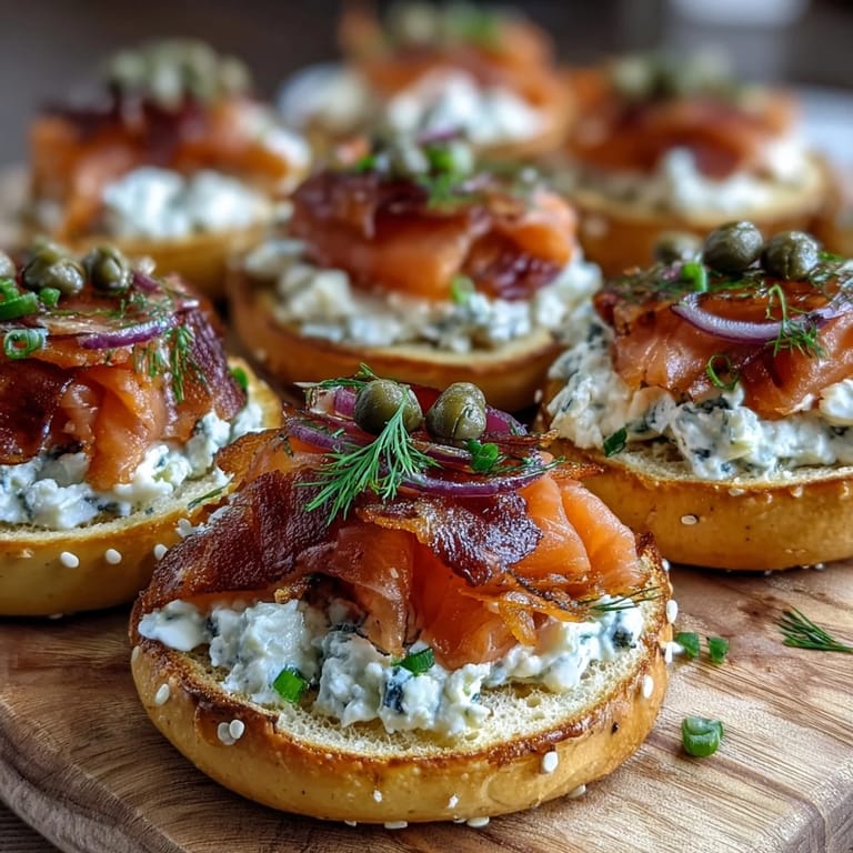This bagel board adapts easily to various dietary preferences and flavor profiles. For a dairy-free version, substitute whipped ricotta or vegan cream cheese blended with the same herbs and lemon juice. Vegetarians can replace smoked salmon with marinated artichoke hearts, grilled vegetables, or seasoned tofu lox for a plant-based twist. Add pickled onions or microgreens for extra flavor dimensions and visual appeal. For a heartier spread, include the optional hard-boiled eggs, radishes, and baby arugula. Consider offering flavored cream cheese variations like everything bagel seasoning mixed in, or sun-dried tomato cream cheese alongside the herb version. You can also swap smoked salmon for gravlax, kippered salmon, or even smoked trout for different flavor profiles while maintaining the elegant brunch aesthetic.