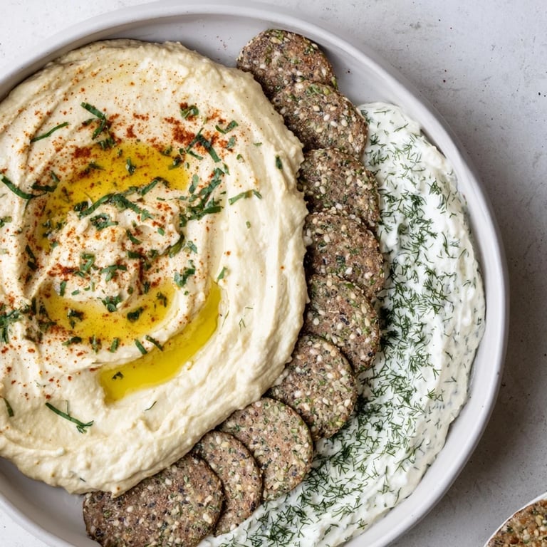 Crackers form a crisp dividing line between the two dips, keeping flavors distinct and providing a crunchy texture for scooping.